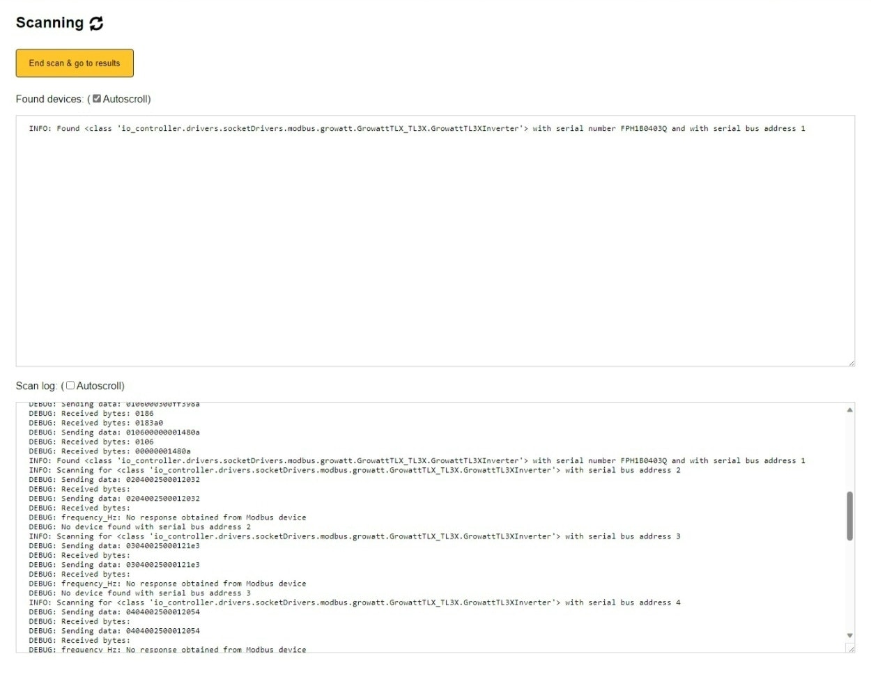 - (Dieser Schritt und die folgenden gelten sowohl für TCP als auch für RS485) Im nächsten Schritt können Sie, falls erforderlich, die Parameter manuell anpassen, die zur Suche nach dem Gerät verwendet werden. In den meisten Fällen empfehlen wir, die Standardwerte beizubehalten.