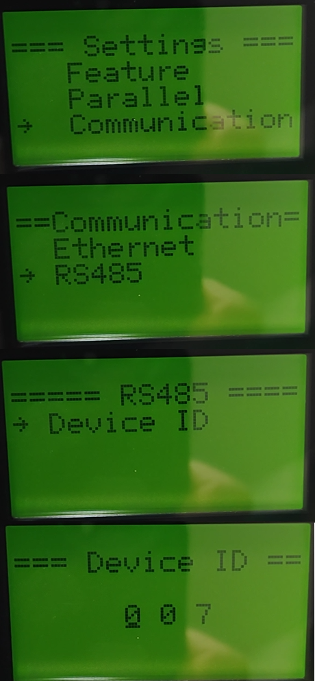 - Stellen Sie die Geräte-ID auf die gewünschte Adresse ein. Wenn Sie mehrere Geräte an denselben RS485-Bus anschließen, müssen Sie jedem eine eindeutige Adresse zuweisen.