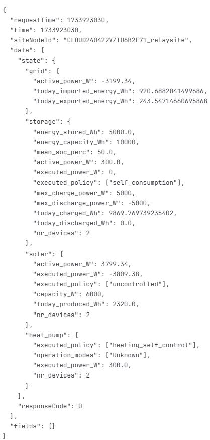 This feedback demonstrates the system's current operational state following the execution of the setpoints, indicating the effects on solar generation, storage, and overall grid interaction.